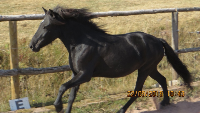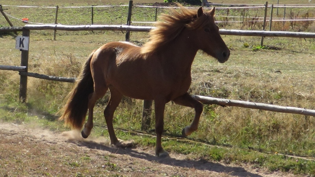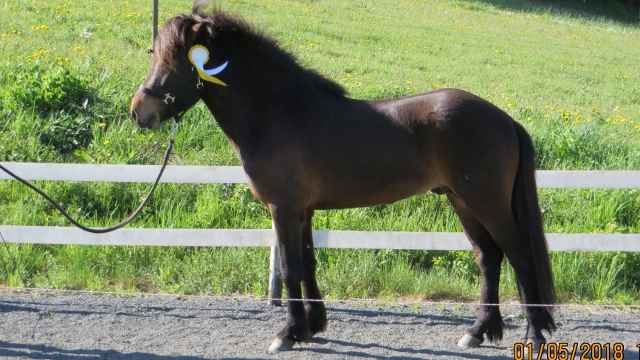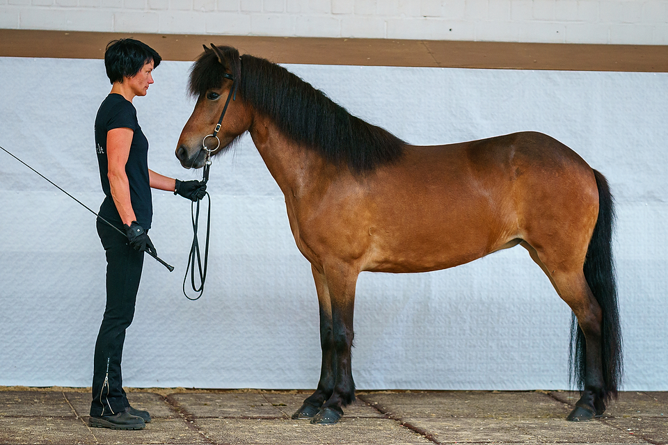 Er erhielt den Richterspruch: "Freundlicher, aufmerksamer Junghengst mit leichtfüßigem, fließenden Bewegungsablauf in Tölt, Trab & Galopp, weitgehend harmonischem Gebäude, klar 5gängig veranlagt."